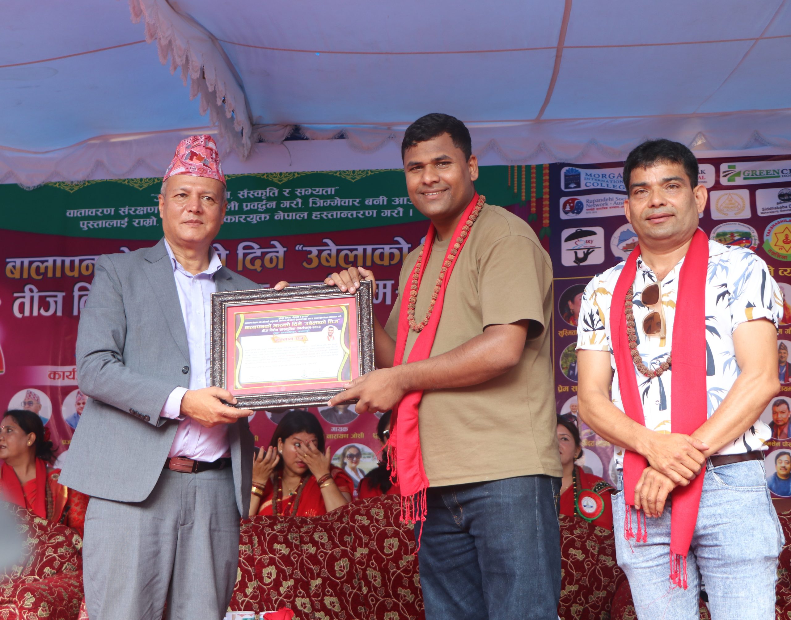 काठमाडौं – टोखा नगरपालिका–६, विद्यानगर म.वि. को प्राङ्गणमा आयोजित “बालापनको सम्झना दिलाउने उबेलाको तीज” विशेष सांस्कृतिक कार्यक्रम–२०८२ मा कान्तिपुर पाटी डटकमका संचालक कविराज ढकाललाई सम्मान गरिएको छ।