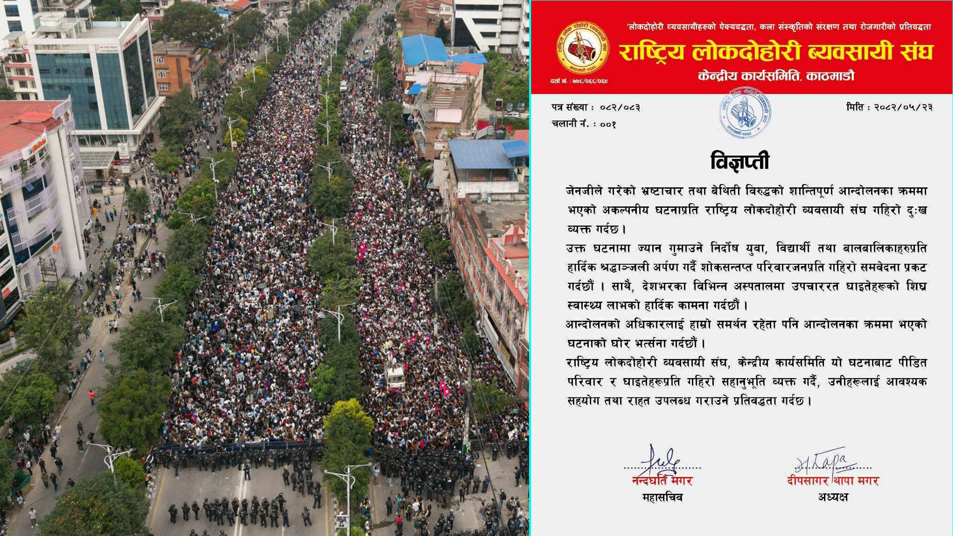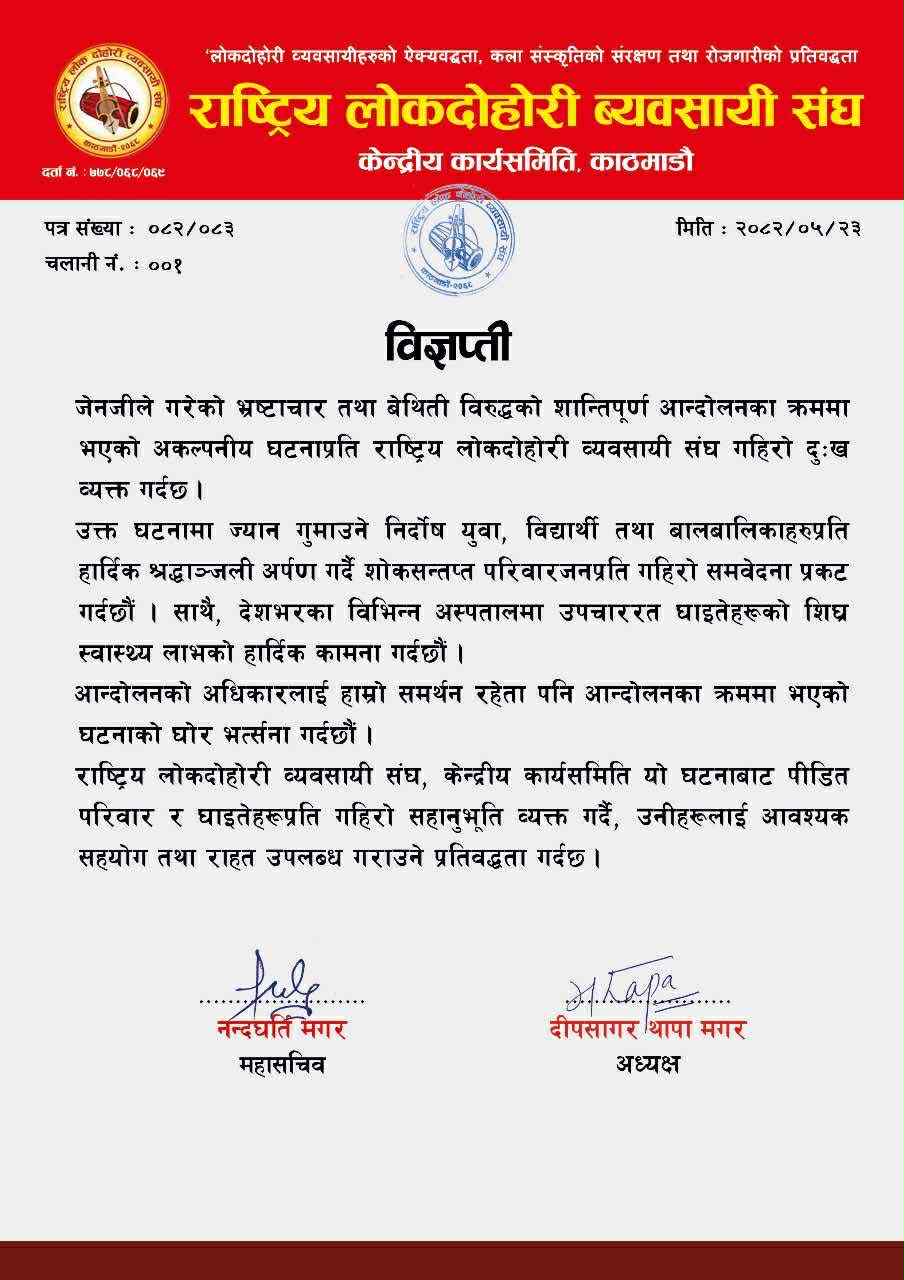 २३ भदौ, काठमाडौं — जेनजी समूहले गरेका भ्रष्ट्राचार र बेथिति विरुद्धको शान्तिपूर्ण आन्दोलनको क्रममा भएको घटनाप्रति राष्ट्रिय लोकदोहोरी व्यवसायी संघले गहिरो दुःख व्यक्त गरेको छ।