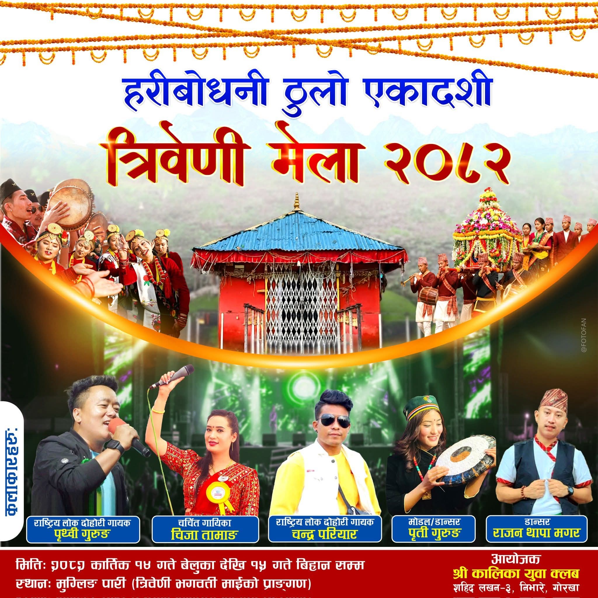 गोरखा: गोरखा जिल्लाको सबैभन्दा होचो भू–भाग मुग्लिङ पारी अवस्थित माता त्रिवेणी माई मन्दिर प्राङ्गणमा आज रातदेखि भव्य हरिबोधनी एकादशीको अवसरमा त्रिवेणी मेला–२०८२ भव्य रूपमा आयोजना हुँदैछ । माता मनकामनाको कान्छी बहिनीको रूपमा पूजिने त्रिवेणी माई मन्दिरमा हरेक वर्ष जस्तै यस वर्ष पनि हजारौं भक्तजन र तीर्थालुहरूको उपस्थितिमा धार्मिक तथा सांस्कृतिक माहोल सिर्जना हुने अपेक्षा गरिएको छ।