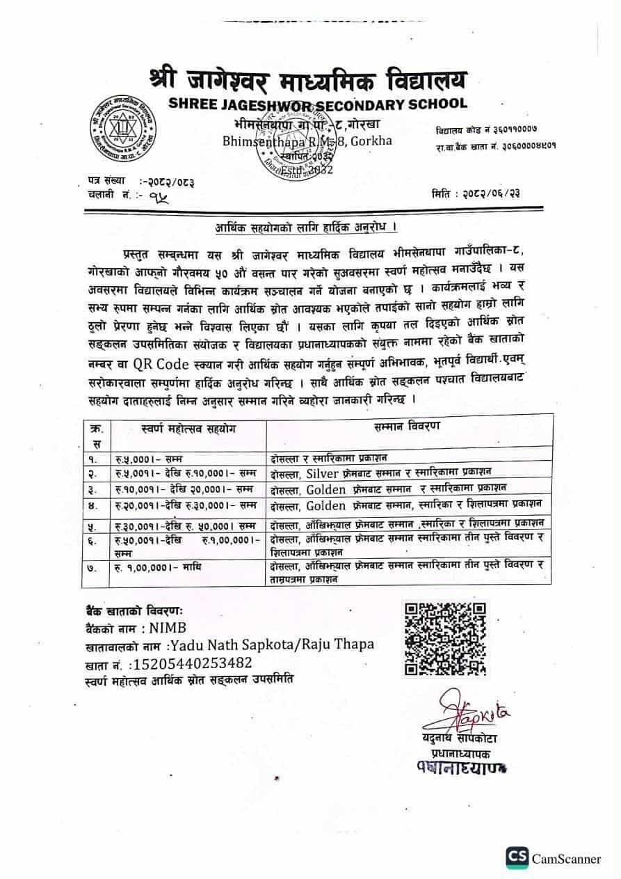 विद्यालयका तर्फबाट जारी सूचनामा आर्थिक सहयोगका लागि सबैलाई आह्वान गरिएको छ। विद्यालयका प्राध्यापक र आर्थिक स्रोत सङ्कलन उपसमितिका संयोजकको संयुक्त नाममा रहेको बैंक खातामा रकम जम्मा गर्न वा QR कोड स्क्यान गरी सहयोग गर्न सकिने व्यवस्था गरिएको छ। विद्यालयले सहयोगदाताहरूप्रति आभार प्रकट गर्दै विभिन्न स्तरका योगदानकर्ताहरूलाई सम्मान प्रदान गर्ने निर्णय गरेको छ।