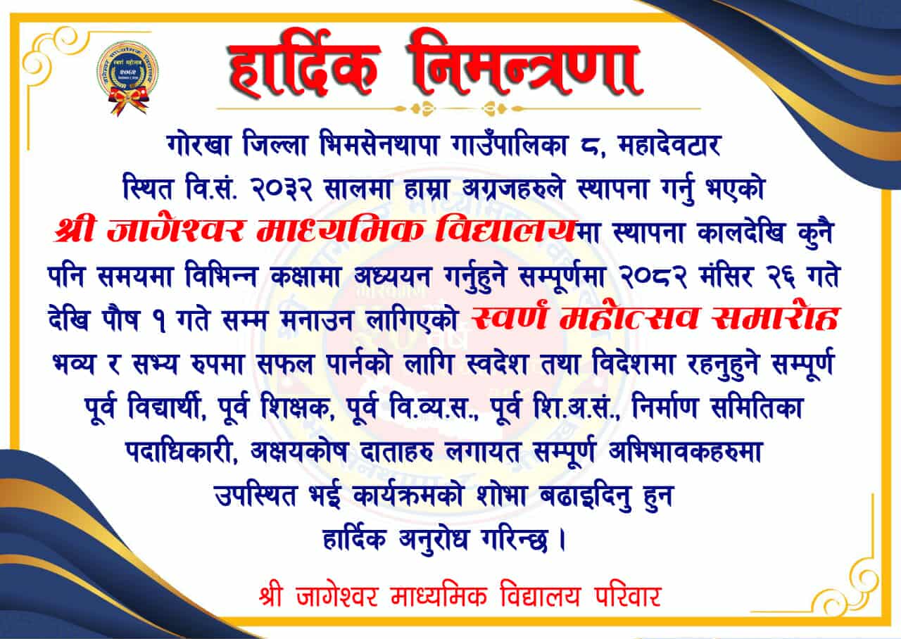 गोर्खा जिल्ला, भीमसेन थापा गाउँपालिका–८ मा अवस्थित एक मात्र माध्यमिक शिक्षण संस्था श्री जागेश्वर माध्यमिक विद्यालयले आफ्नो गौरवमय ५० औँ स्थापना दिवसको अवसरमा स्वर्ण महोत्सव मनाउने भएको छ। विद्यालय व्यवस्थापन समितिका अनुसार महोत्सव यही मङ्सिर २६ गतेदेखि पुष १ गतेसम्म विविध सांस्कृतिक, शैक्षिक र खेलकुद कार्यक्रमका साथ भव्य रूपमा आयोजना गरिने तयारी भइरहेको छ।