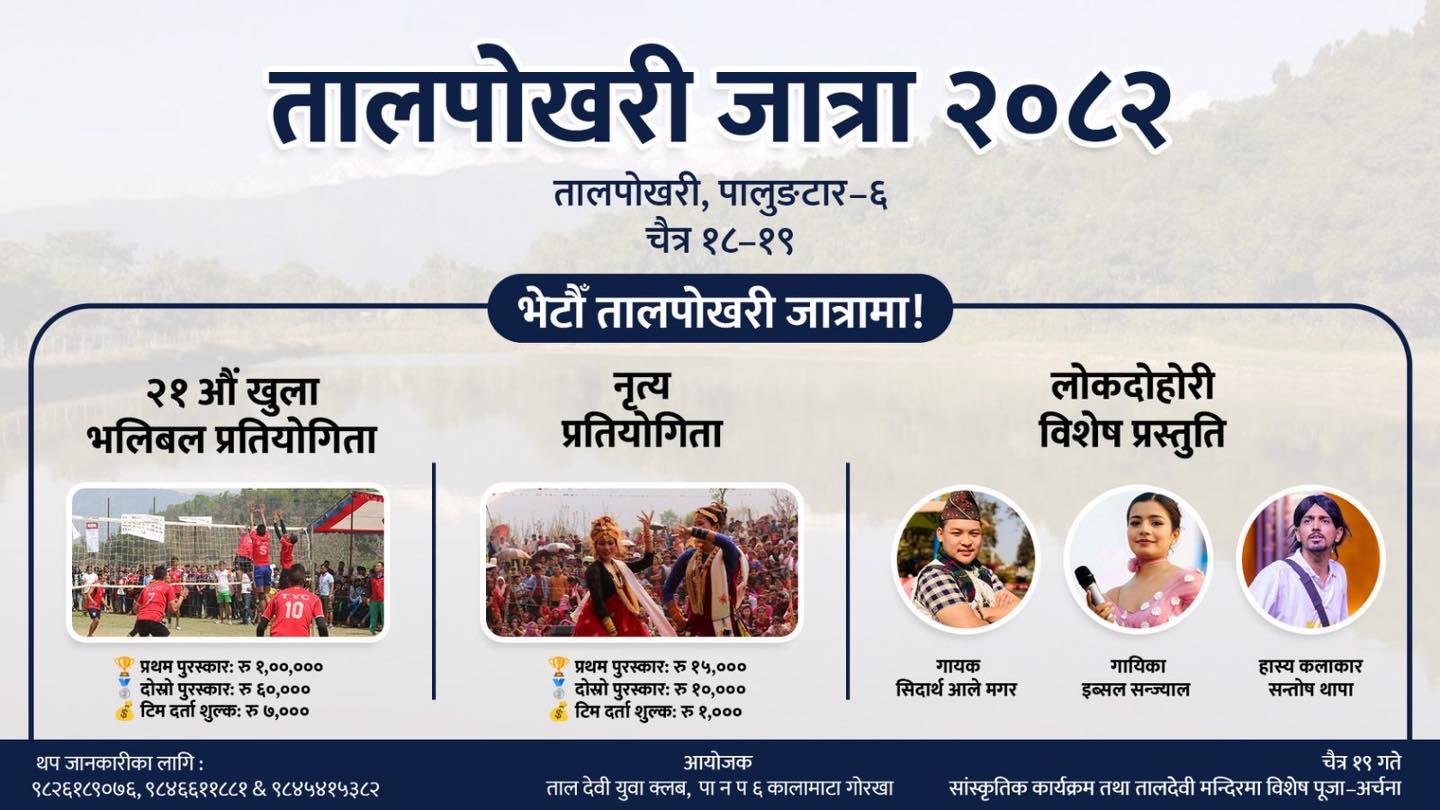 गोरखा: तालपोखरी जात्रा यस वर्ष पनि गोरखा जिल्लाको पालुङटार नगरपालिका–६ कालामाटामा अवस्थित तालपोखरी मा भव्य रूपमा आयोजना हुने भएको छ। स्थानीय धार्मिक तथा सांस्कृतिक महत्व बोकेको यस जात्राले वर्षेनी झैँ यसपटक पनि व्यापक आकर्षण थप्ने अपेक्षा गरिएको छ। तालपोखरी क्षेत्रमा अवस्थित तालदेवी मन्दिरप्रति स्थानीयवासीहरूको गहिरो आस्था रहँदै आएको छ। यही आस्थाका कारण जात्राको अवसरमा विशेष पूजा–अर्चना तथा धार्मिक कार्यक्रमहरू आयोजना गरिनेछन्। साथै परम्परागत रूपमा माछा पालन गरिँदै आएको यस क्षेत्रमा जात्राका बेला माछा मार्ने तथा वितरण गर्ने प्रचलनले कार्यक्रमलाई अझ विशेष बनाउने गर्दछ।
