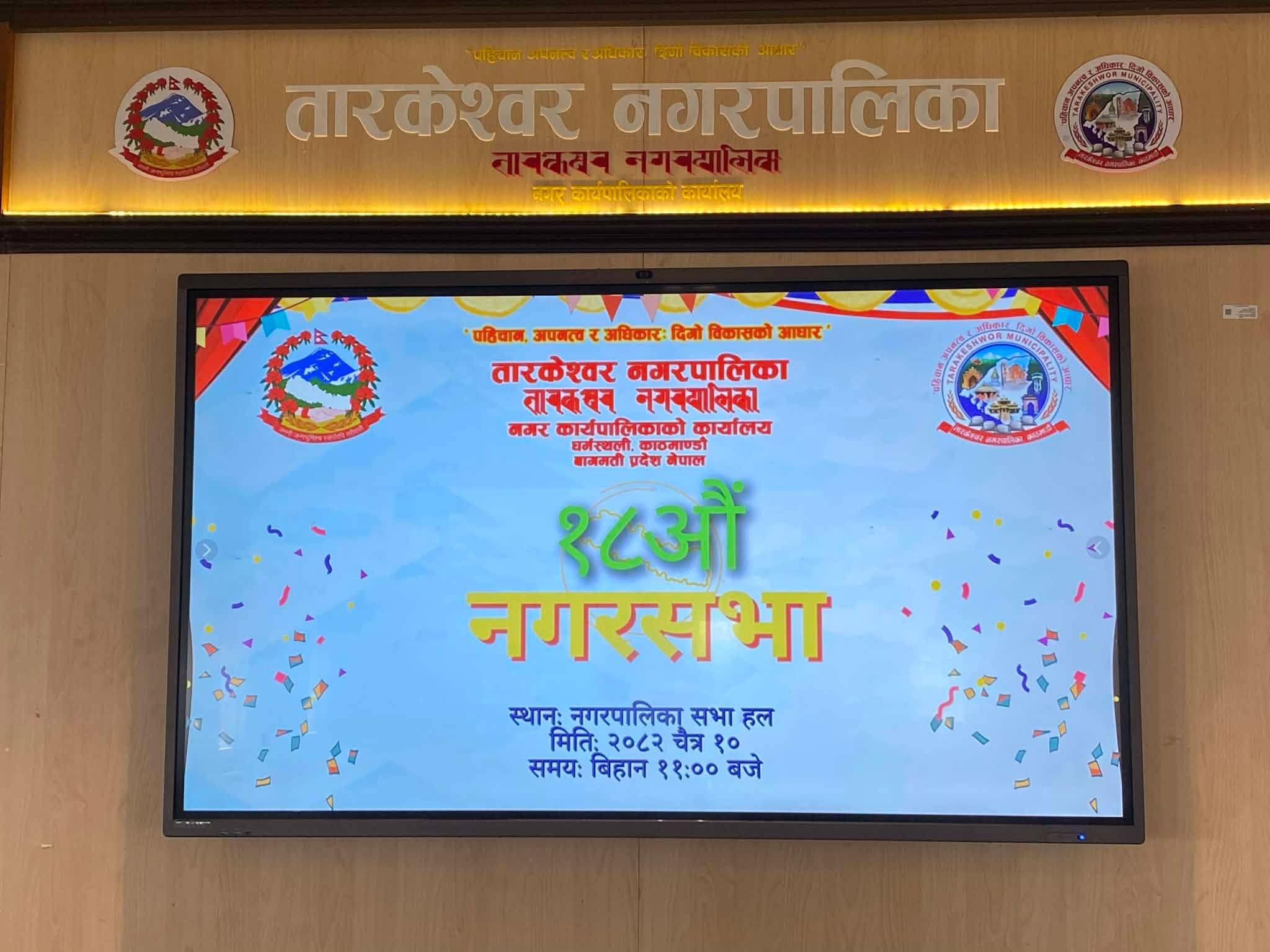काठमाडौं — तारकेश्वर नगरपालिकाको सभाहलमा आज १८औँ नगर सभा सफलतापूर्वक सम्पन्न भएको छ।