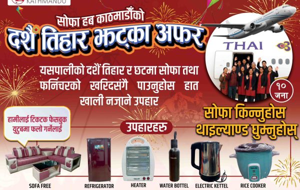 काठमाडौं । दशैँ–तिहारलाई लक्षित गर्दै नेपालकै अग्रणी सोफा तथा गृहसज्जा उत्पादन गर्ने संस्था सोफा हब काठमाडौं ले उपभोक्तालाई आकर्षित गर्ने गरी विशेष योजना सार्वजनिक...