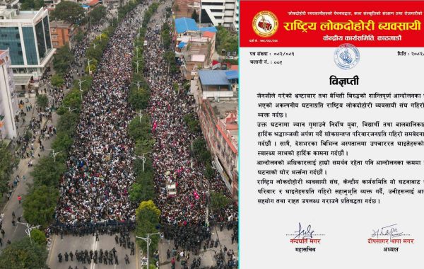 २३ भदौ, काठमाडौं — जेनजी समूहले गरेका भ्रष्ट्राचार र बेथिति विरुद्धको शान्तिपूर्ण आन्दोलनको क्रममा भएको घटनाप्रति राष्ट्रिय लोकदोहोरी व्यवसायी संघले गहिरो दुःख व्यक्त गरेको...