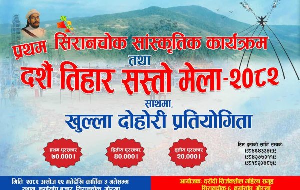 गोरखा — गोरखाको सिरानचोक गाउँपालिकामा पहिलोपटक भव्य सिरानचोक सांस्कृतिक कार्यक्रम तथा दशैं–तिहार सस्तो मेला–२०८२ आयोजना हुने भएको छ। असोज २२ गतेदेखि कार्तिक ३ गतेसम्म नयाँसाँघु...