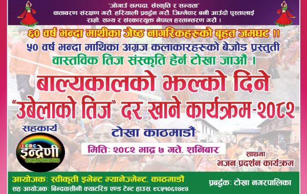 काठमाडौं । टोखा नगरपालिकाको आयोजनामा बाल्यकालको झल्को दिने ‘उबेलाको तिज’ तथा सम्मान र दर खाने कार्यक्रमको आयोजना हुने भएको छ । कार्यक्रम यही भदौ...