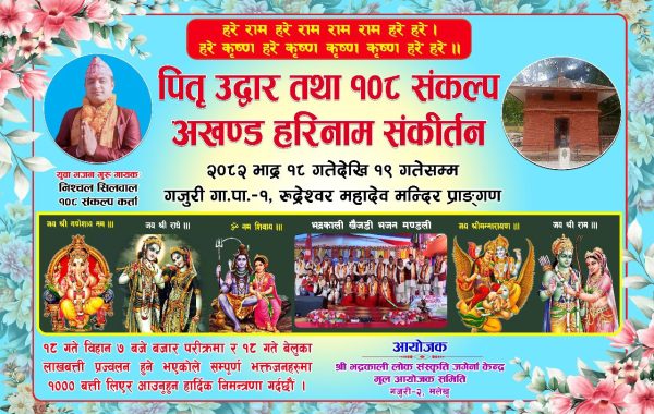 धादिङ, भदौ ११ – गजुरी गाउँपालिका–१ स्थित रूद्रेश्वर महादेव मन्दिर प्राङ्गणमा आगामी भदौ १८ र १९ गते “पितृ उद्धार तथा १०८ संकल्प अखण्ड हरिनाम...